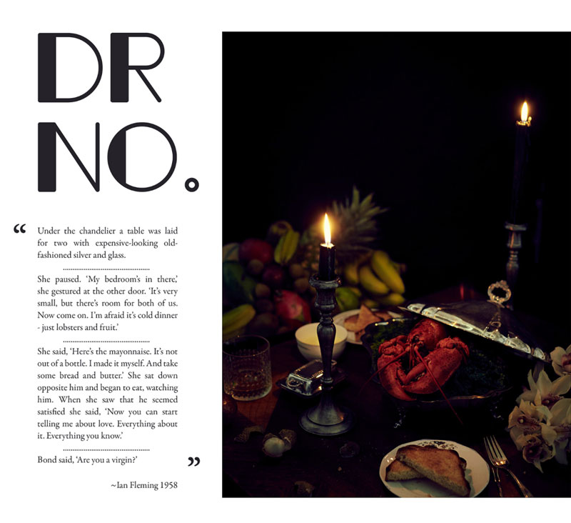 They decided to present one meal from each book. The shots were styled and lit to match the scenes from the book in which the meal takes place. To increase the sense of authenticity, they added objects that it's reasonable they could have been present during the meal. In one shot you can see Bond's trusty Ronson lighter lying on the table and in another you'll find his summer hat casually put on a stool.