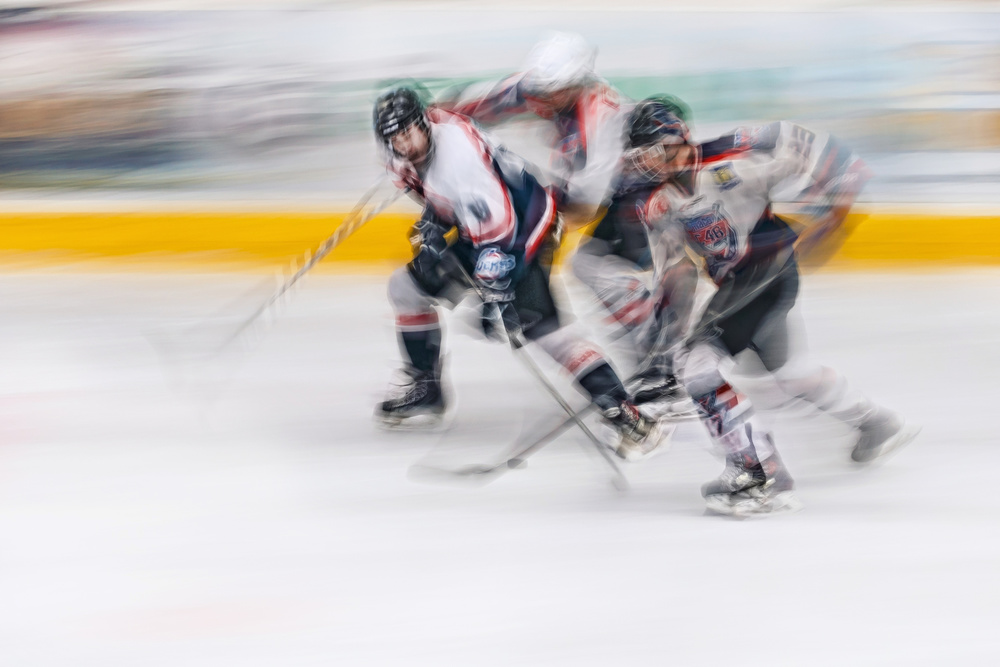Ice hockey is really a sport of speed, fast turns, and some push and pull. It is all in Dusan's photograph. Look at the of speed, which is represented is different ways: in the background by the tracking of the camera and in the action of the players, which is clear enough to tell apart the pushing and pulling. The players are well placed. It is as if they are skating into the picture and at the left side they get enough place to move on.
