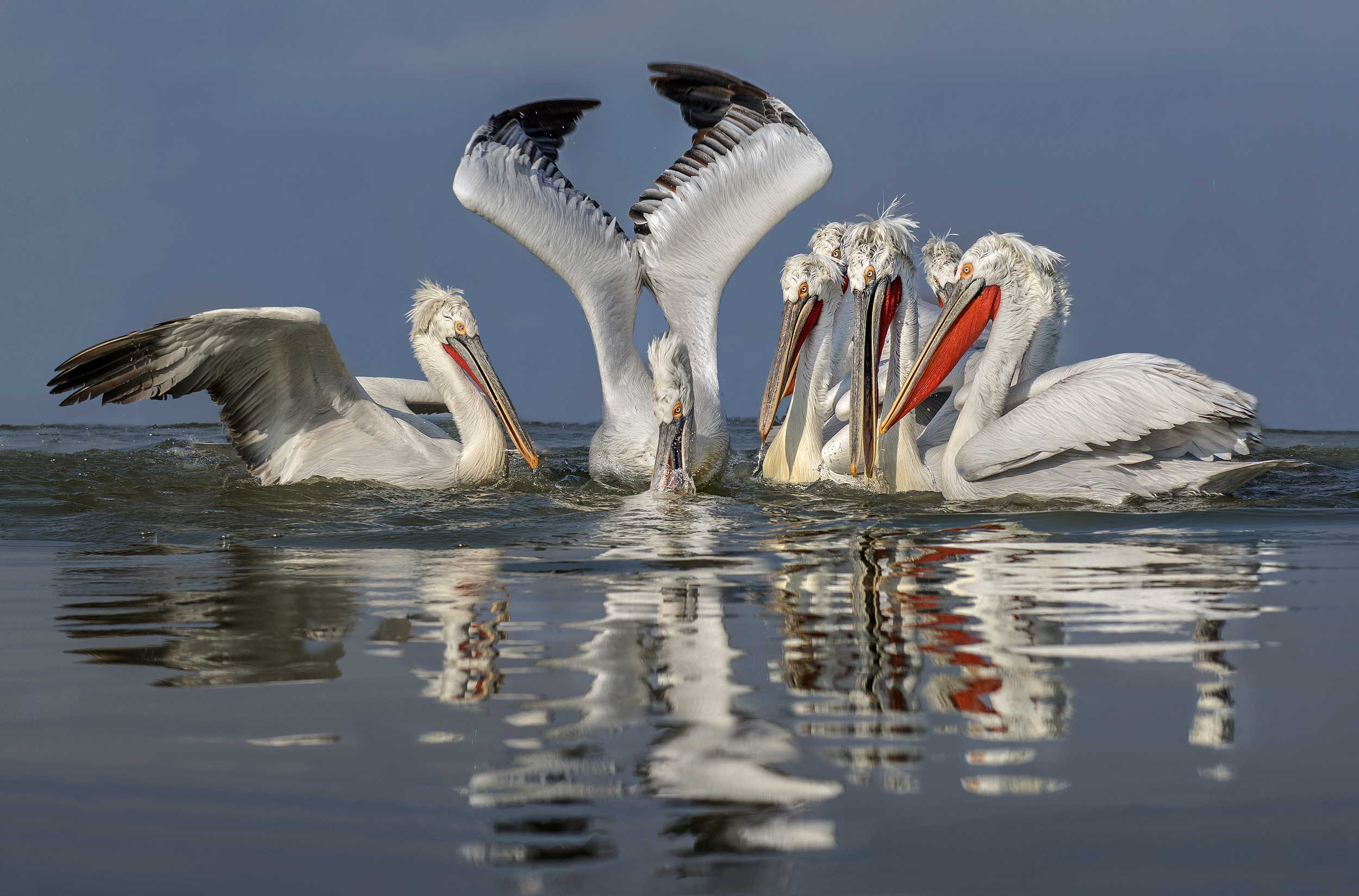 The pelican uses its beak like a landing net or scoop to catch fish. To do this, it opens its beak and "floods" the skin bag with water. Then it opens its beak slightly to let the water flow out again. The tasty fish remain and land in the hungry stomach.