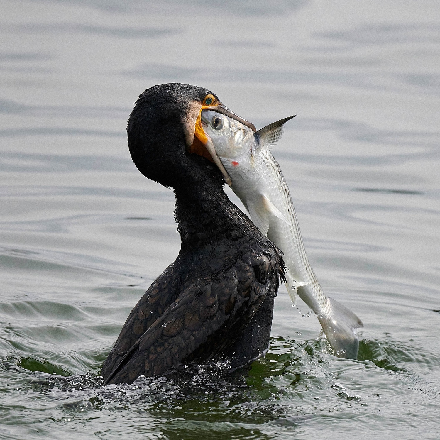 When the cormorant is near suitable prey, it pounces on the fish and grabs it in its beak. It usually brings its prey to the surface, flattens it in its beak and swallows it in one go. Great Cormorant catches all kinds of fish, such as herring, plaice, cod or eels, which it discovers at depths of up to ten metres.