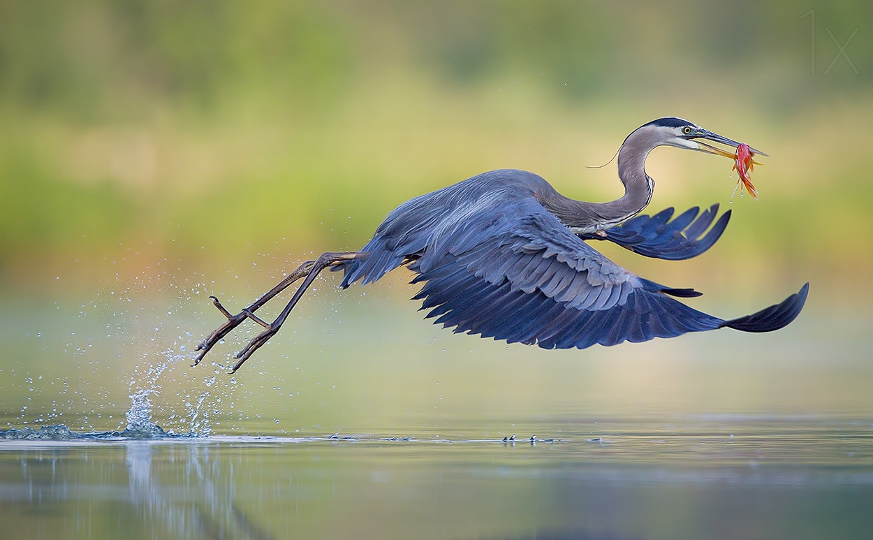 Great blue herons typically hunt fish by standing very still near the edge of or in the water. However, they can also catch fish while walking or flying.