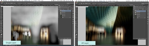 5) I was not quite happy with the picture yet. I needed more emphasis on the central gridded structure and some of the figures. So I made more copies of the Motion Blur layer. Using the Eraser tool again with a soft brush and Opacity set to 8-10%, I revealed more of the underlying background layer.