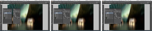 2) I made a copy of the Motion Blur layer, and using the Eraser tool with a soft brush and Opacity set to 8-10%, I gradually erased the specific areas that I wanted to be sharper in the image. By clicking on the eye beside the underlying layers in the Layers Panel, I was able to see exactly what I was erasing. The screenshot on the left shows what I erased with the other two layers turned off. The screenshot on the right shows two of the three layers turned on (the top and bottom layers) and what the Eraser tool revealed in the underlying original background layer.