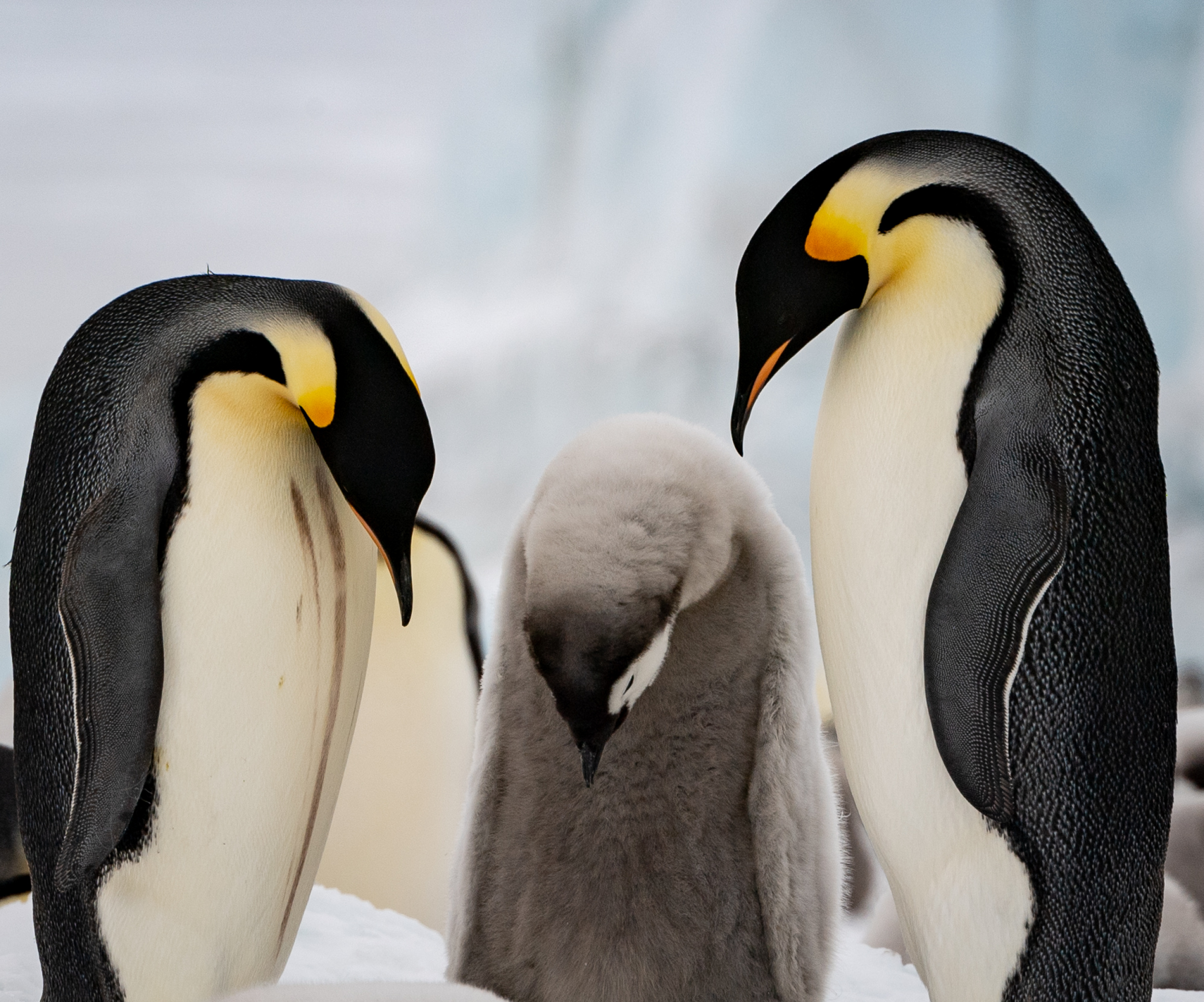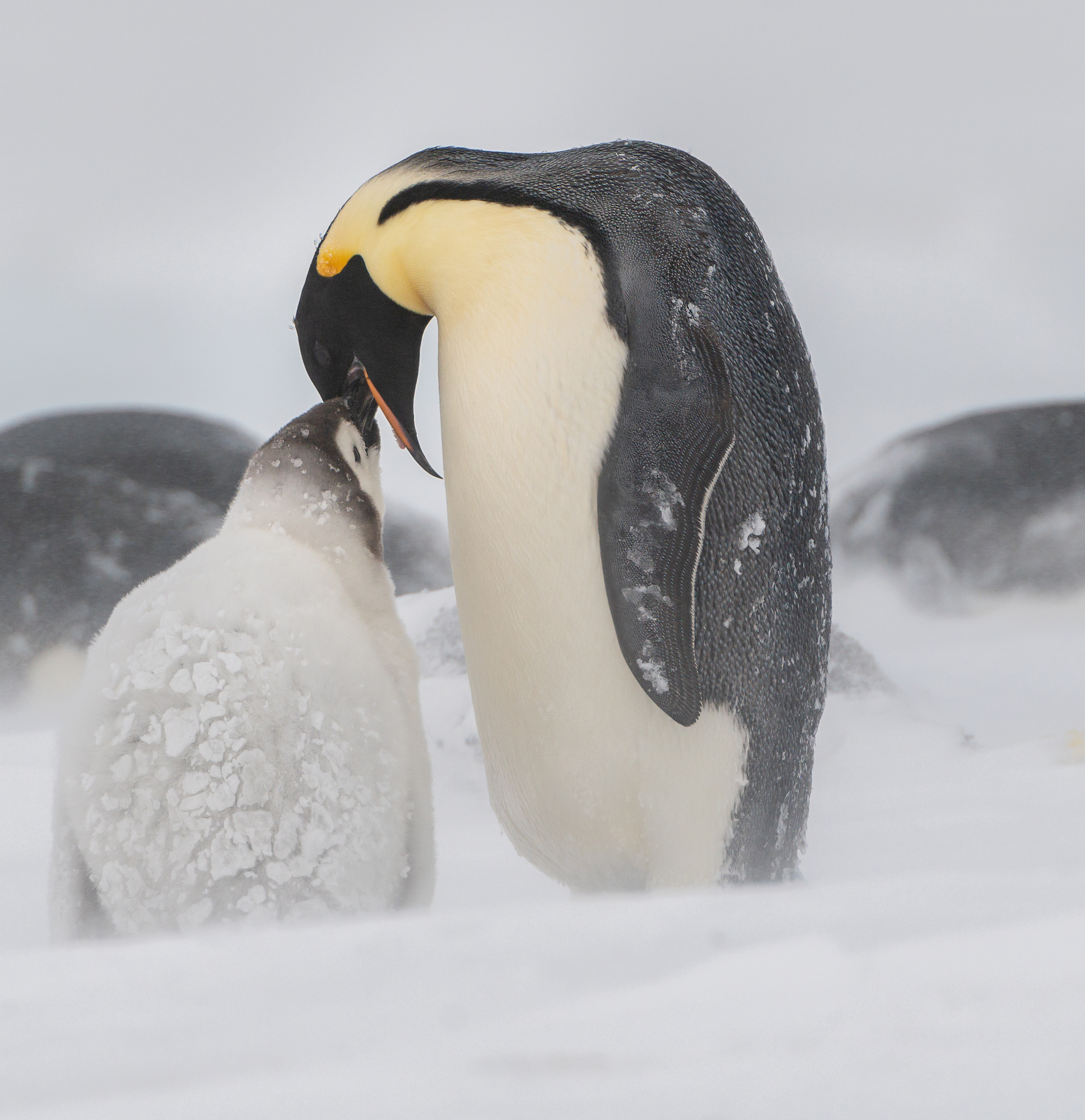 'No tickle please, Dad-Emperor penguin chick with dad behind'