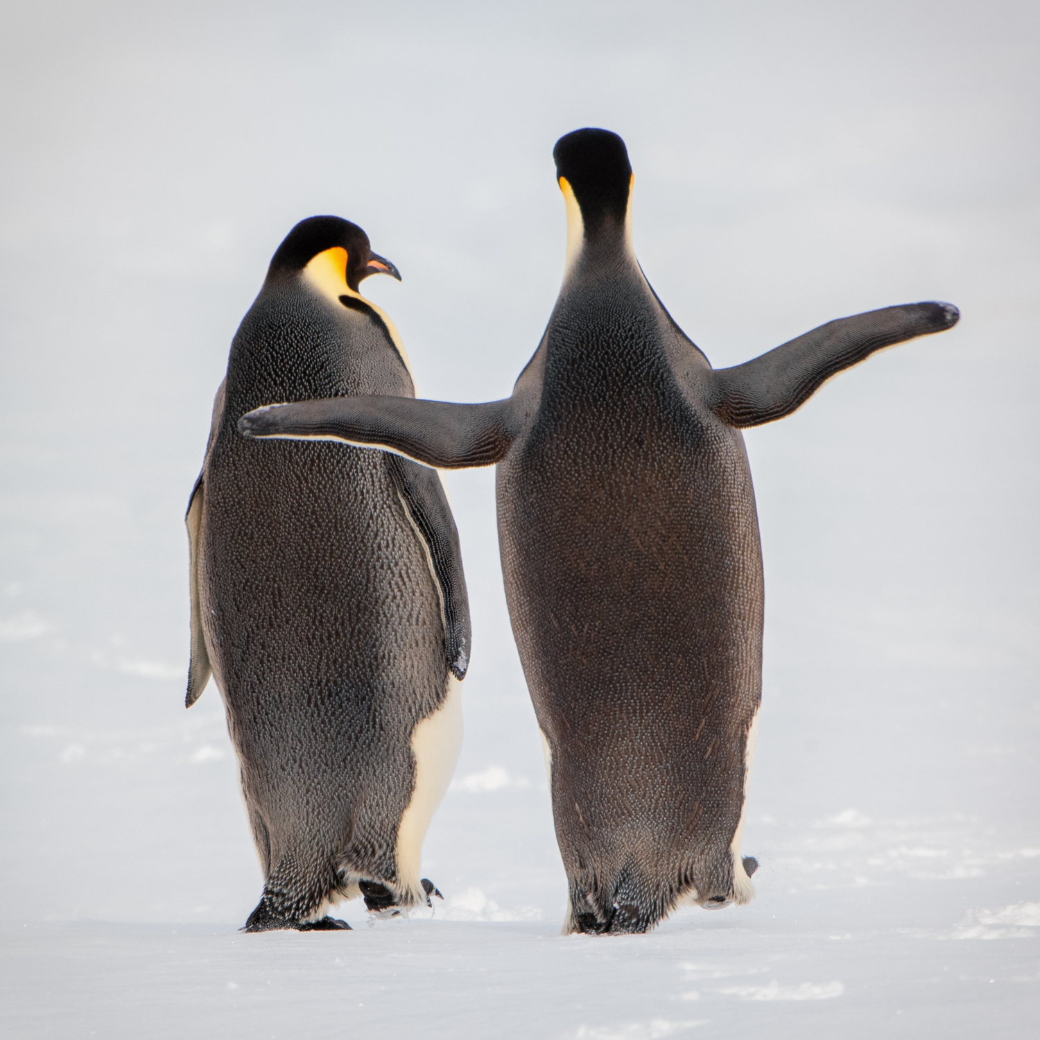 'Brother, let me tell you-Two emperor penguins talks while walking together'