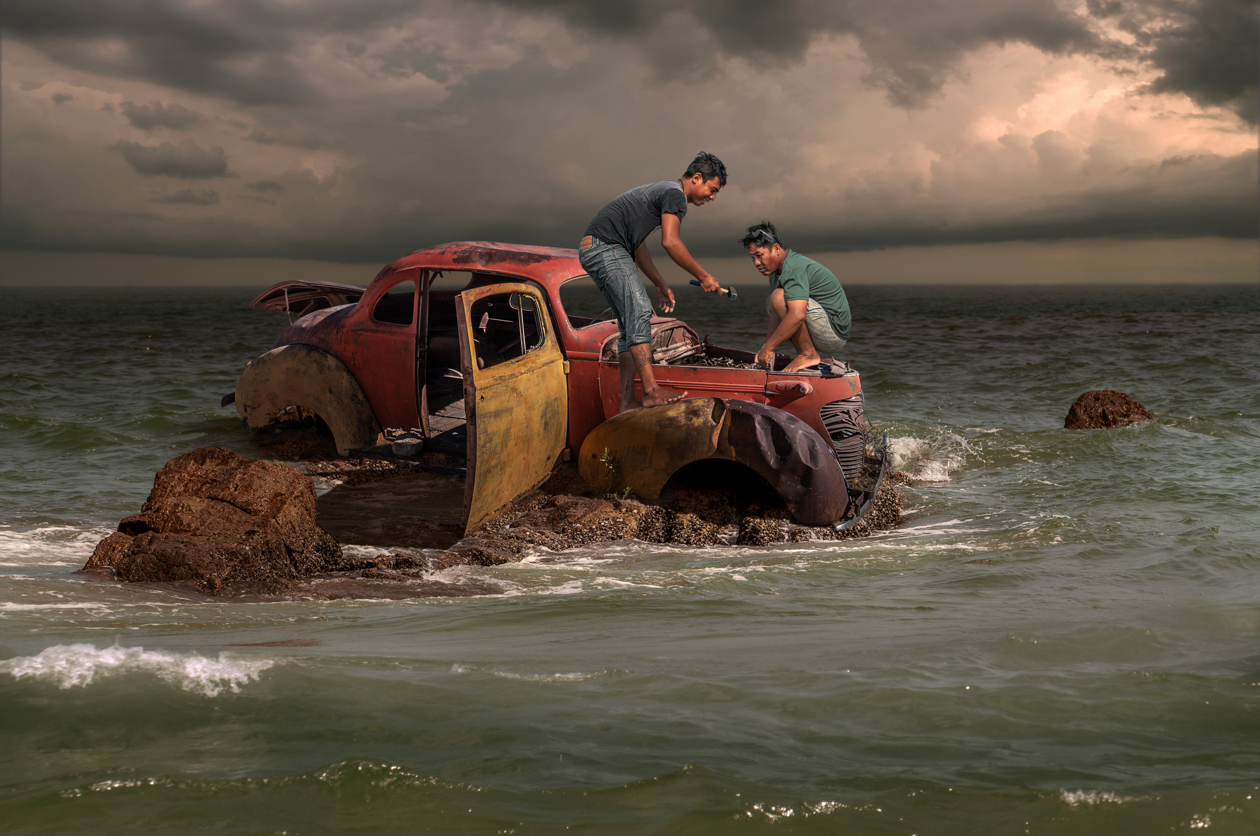 In our photography club, www.erster-fotoclub-lustenau.at, of which I am chairman, we are currently running a matrix competition for our members. At our Christmas party, nine terms were drawn at random, and members are now allowed to create a photo or image containing at least three of these terms. We meet every other week and anyone who attends the club evening can bring a new image. We then review the entries and compile them for a club championship, which is judged by another photography club. The images will be presented to the public at a large photo exhibition in autumn. Our terms are: yellow, face, central perspective, handbag, walking, green, dramatic, close-up and out of focus. For my photo, 'Car Mechanic', I included as many terms as possible. Feel free to take a look and see how many you can spot. I found the car wreck in the desert while travelling in Namibia, and the mechanics were actually fishermen from Thailand. The background is also from the island of Koh Samui. With a lot of imagination, a touch of madness and the magic of Photoshop, I created this image. Our members know my incredible photos and are always excited to see my latest creations.